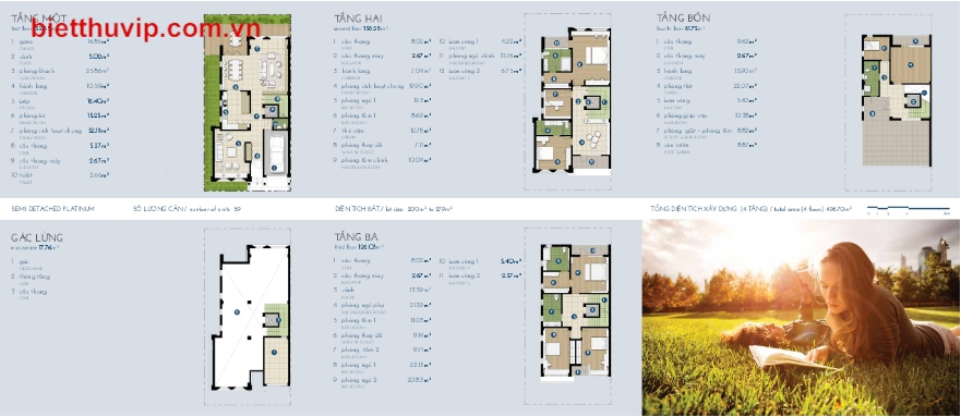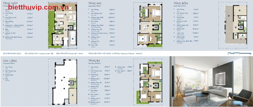 Các căn biệt thự song lập vàng được thiết kế 4 tầng 1 gác lửng với diện tích 413,5m2.