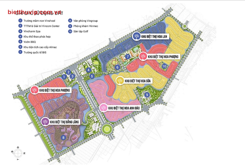 Quy hoạch theo 5 phân khu: Biệt thự Bằng Lăng, biệt thự Hoa Phượng, biệt thự Hoa Lan, biệt thự Hoa Sữa và biệt thự Hoa Anh Đào.